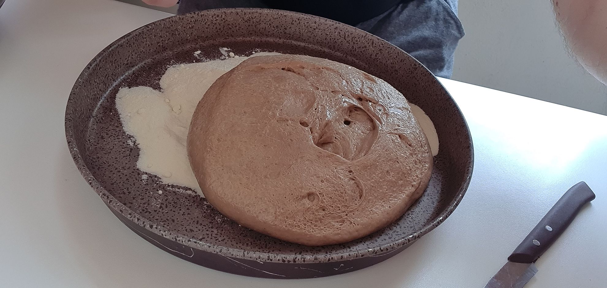 - Appena l'impasto raggiunge l'incordatura, versare su una spianatoia e fare un giro di pieghe dopodichè coprire e attendere 15 minuti